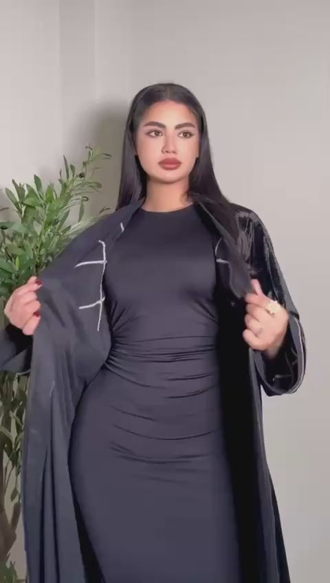 عباية أنيقة بتصميم فاخر مصنوعة من قماش المخمل الناعم الذي يمنح إطلالة راقية ومميزة. تتميز هذه العباية بتفاصيل تطريز بالأحجار اللامعة على الأكتاف والأكمام، مما يضيف لمسة من الفخامة والجمال.